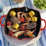 Our cast iron deep square grill lets you create delicious, healthy dishes. It cooks large pieces of meat, poultry and vegetables quickly and evenly, separating your food from its fat while the deeper walls minimise cooking splashes and enclose juices when making sauces. And it makes great-looking char lines too. Two handles and pouring lugs make moving and serving effortless.