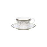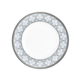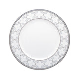 Trefolio Platinum (4957) features a repeating stylized four-leaf-clover design, presented in multiple sizes on different pieces for maximum impact. The larger presentation is punctuated with raised enamel dots. The soft coloration of white and cream paired with platinum makes this pattern accessible and appropriate to pair with any style of decor.