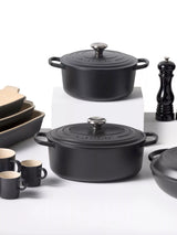 The black enamel interior offers a more robust, professional-grade cooking surface that excels with high-heat techniques such as searing, grilling, and roasting. Its matte finish enhances caramelisation and develops rich flavour, making it a favourite for meats and deeply flavoured dishes. Built to be exceptionally durable, the black enamel resists dulling, staining, and scratching, while requiring no seasoning—combining the traditional performance of cast iron with the ease of modern care.